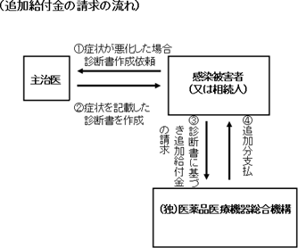 給付金の支給を受けた後20年以内に症状が進行した場合、追加給付金を支給します。症状進行の判断は、医師の診断書(別紙様式第三号)により行います。症状が進行した区分の額から、既に支給された給付金を除いた額を支給することになります。