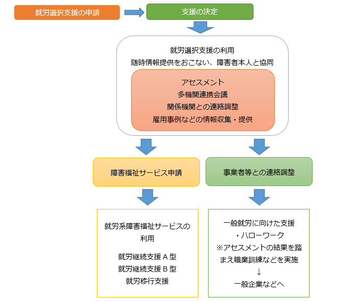 まず、障害者本人が市区町村の相談窓口に相談・就労選択支援の利用申請をおこないます。申請するにあたり、相談支援事業所や本人による「サービス等利用計画案」の作成・提出が必要です。そして、この内容をふまえて自治体が支給決定をおこないます。就労選択支援サービスの利用開始後は、利用者の適性やスキルを把握し、希望に応じた進路に踏み出せるよう関係機関と連携をとり支援します。