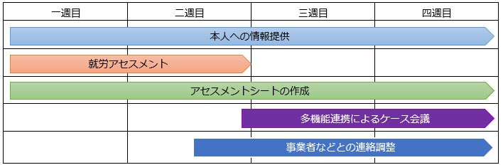 就労選択支援は、1ヶ月を標準利用期間としているため、短期間のうちに障害者本人による作業体験、支援側によるアセスメントの作成、関係機関との連絡調整をおこないます。